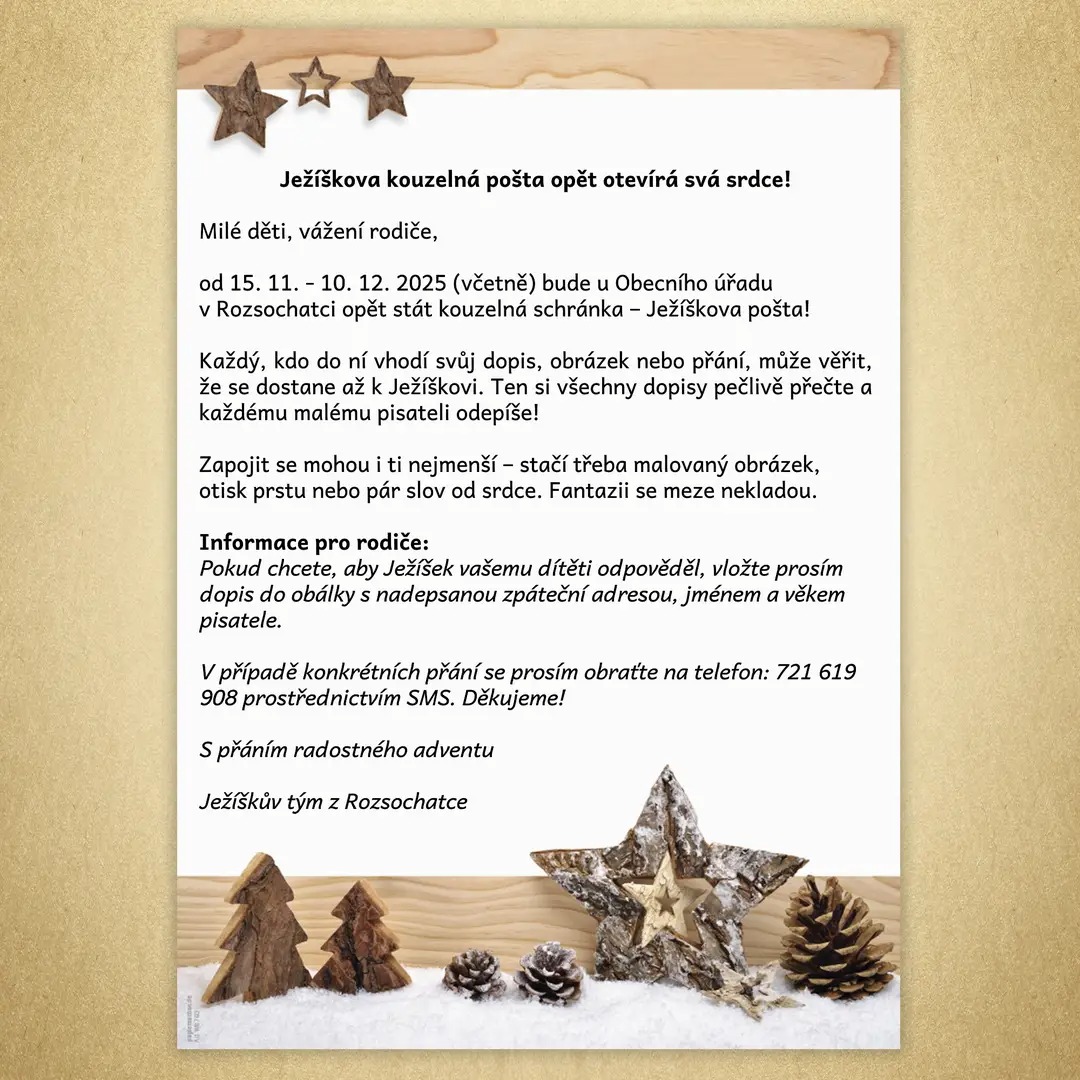 od 15. 11. - 10. 12. 2025 (včetně) bude u Obecního úřadu v Rozsochatci opět stát kouzelná schránka - Ježíškova pošta!